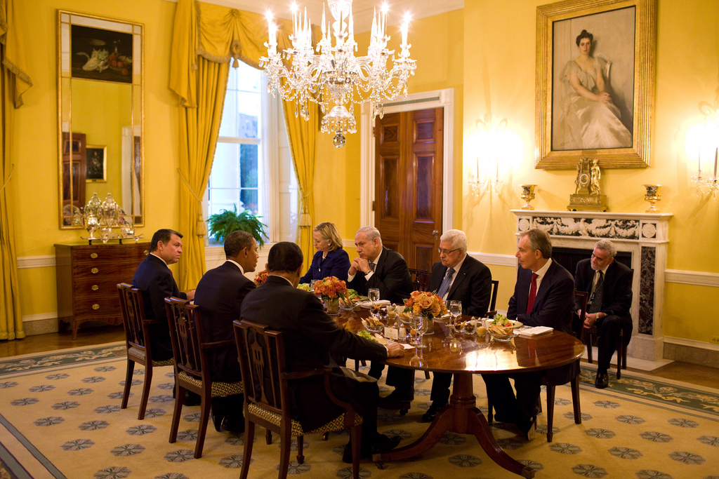 President Barack Obama holds a working dinner with, clockwise from left, President Hosni Mubarek of Egypt, King Abdullah II of Jordan, Secretary of State Hillary Clinton, George Mitchell, Special Envoy for Middle East Peace, Prime Minister Benjamin Netanyahu of Israel, President Mahmoud Abbas of the Palestinian Authority, and Tony Blair, the international Middle east envoy and former British Prime Minsiter, in the Old Family Dining Room of the White House, Sept. 1, 2010. (Official White House Photo by Pete Souza)