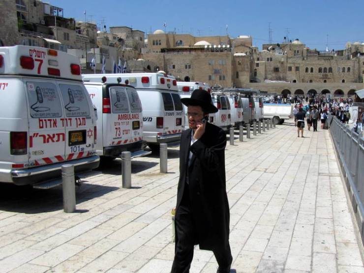 Om kwart over een vrijdag hadden de oproeragenten de helmen opgezet. Ze brachten niet alleen de wapenstokken mee, maar ook de brancards. Ze stonden op de toegangsstellage die is aangebracht voor de Mughrabi poort in de Westelijke Tempelmuur. Op het plein voor de westelijke gebedsmuur stonden vier ambulances en ongeveer twintig politieauto’s.
