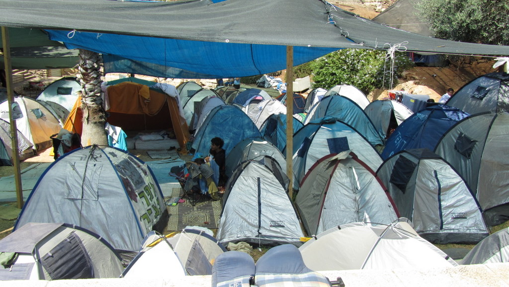 Onder leuzen als “een huis voor iedereen” hebben actievoerders voor betaalbare woningen hun tenten opgeslagen in een parkje aan de drukke King George winkelstraat in het centrum van Jeruzalem. Voor zaterdagavond zijn demonstraties in Beersjeva en andere steden gepland. Aan de demonstraties vorige week op zaterdagavond deden 300.000 mensen mee. Foto’s (c) Alfred Muller