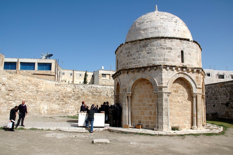 Voor deze moskee staat een bord ‘Kapel van de Hemelvaart’. Christenen kunnen de kapel bekijken tegen betaling van een dollar aan de moslims. In het centrum van het ronde gebouwtje bevindt zich nog steeds de rots waarin bezoekers, als ze hun verbeeldingsvermogen op volle toeren laten draaien, de laatste, ‘heilige’ voetafdruk van Jezus kunnen zien.