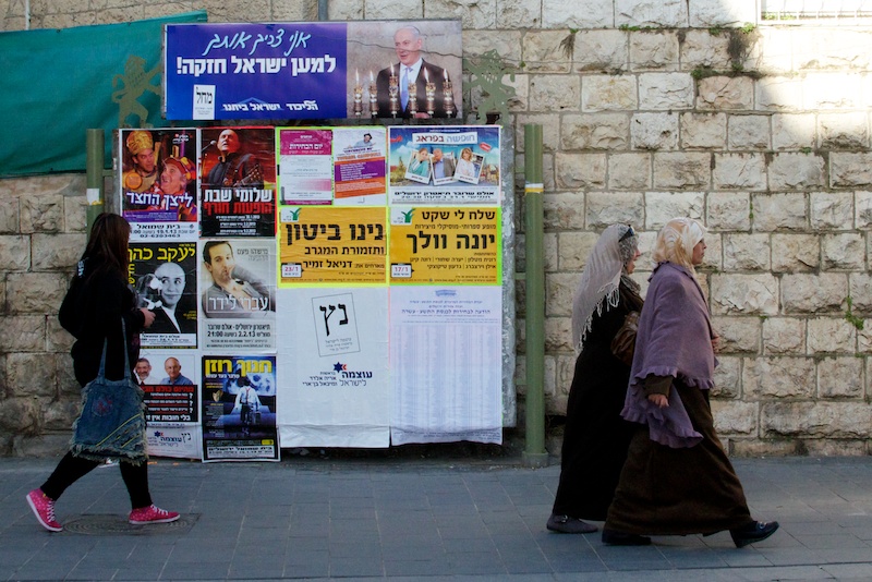 Vrouwen lopen langs een bord van de Likud met een foto van Benjamin Netanyahu met de tekst: ‘Ik heb je nodig voor een sterk Israël’. Foto: © Alfred Muller
