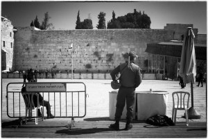 Lid van de grenspolitie hield de wacht gisteren bij de Westelijke Muur. Rechts de stellage die leidt naar de Mughrabi poort van de Tempelberg. Foto: © Alfred Muller