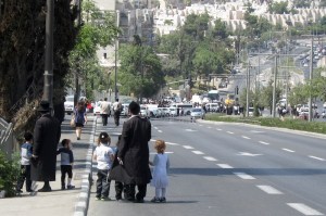 ALMU20140804_8228 Ultraorthodoxe vaders en hun kinderen kijken in de richting waar de aanslag plaatsvond. Foto: Alfred Muller