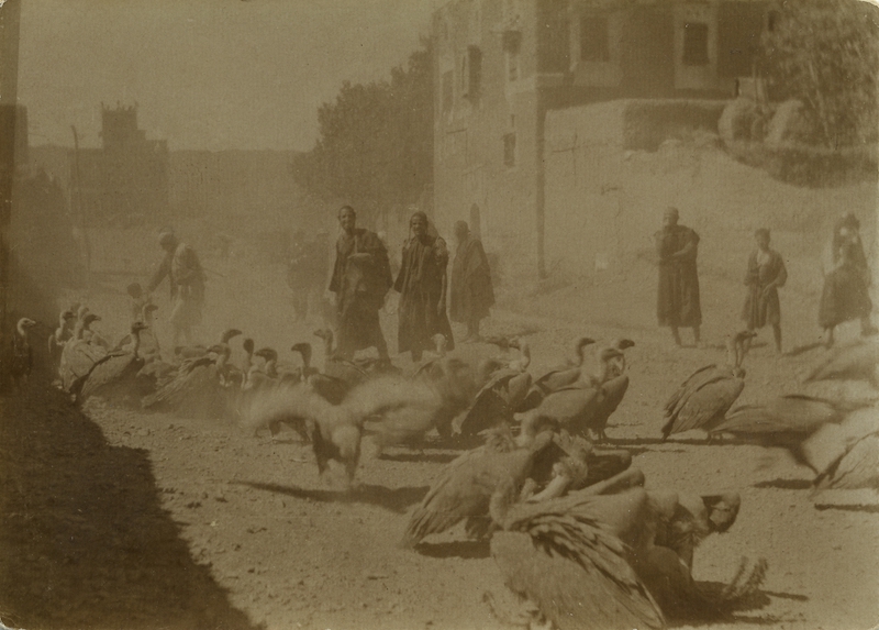 Op de foto’s: Het joodse gezin van Muse Serri. Thee in de tuin van een Italiaanse arts. Joodse mannen gooien doden dieren buiten de stad. Gieren verzamelen zich er omheen. Yihye Haybi maakt een zelfportret, 1937.