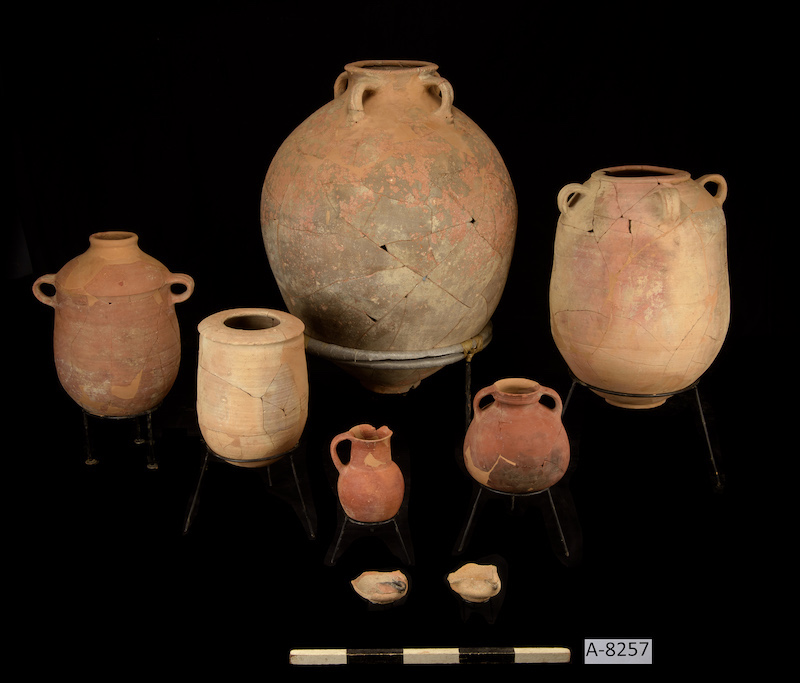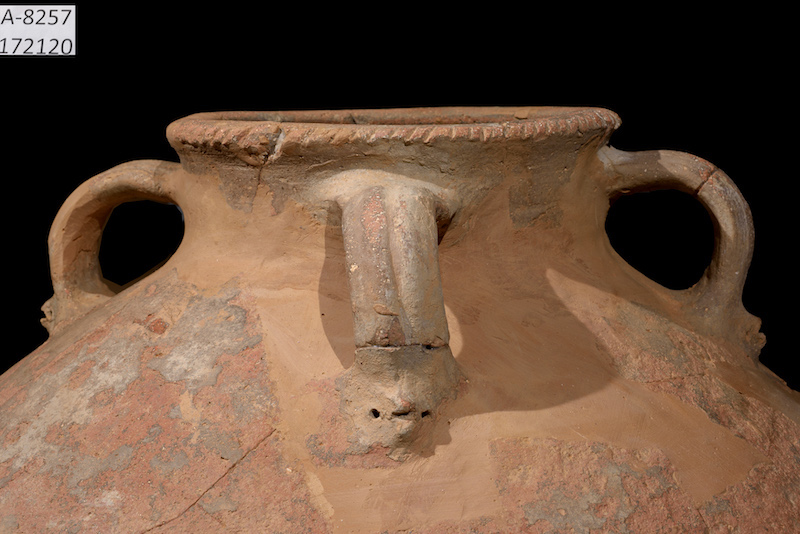 Groot voorraadvat met handvatten gedecoreerd in de vorm van een gezicht. Foto – Dafna Gazit, Israëlische Oudheidkundige Dienst. Restauratie – Joseph Bocangolz