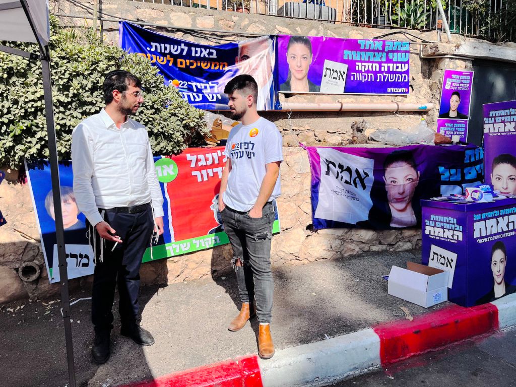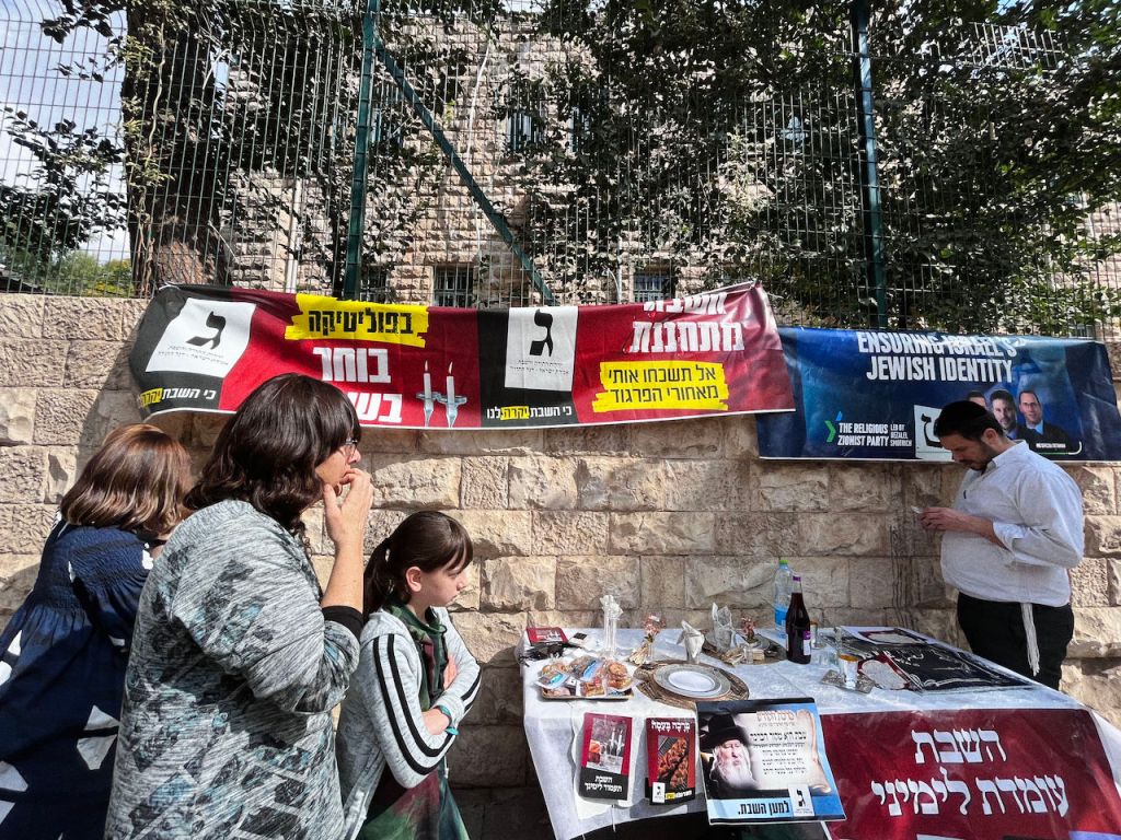 Actievoerders van de partij Verenigd Thora Judaïsme hebben voor de verkiezingslokalen een sjabbattafel opgesteld. „Het belangrijkste van alles is dat Israël als Joodse staat de sjabbat houdt”, vertelt Laby. „Dat maakt ons als Joodse volk zo speciaal. Op deze manier maken we God blij en daar kunnen wij als Joodse volk trots op zijn.”