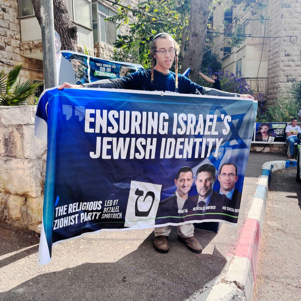 Zvi, die achter een spandoek staat van Bezalel Smotrich, vertelt in de Jeruzalemse Rehavia wijk wat de partij wil. „Belangrijk is dat Israël een Joodse staat is. Dat betekent dat er geen Arabieren in de Knesset mogen zitten en dat Judea en Samaria [de Westelijke Jordaanoever, AM] een deel van Israël moeten worden.”